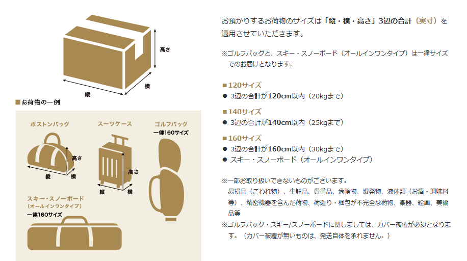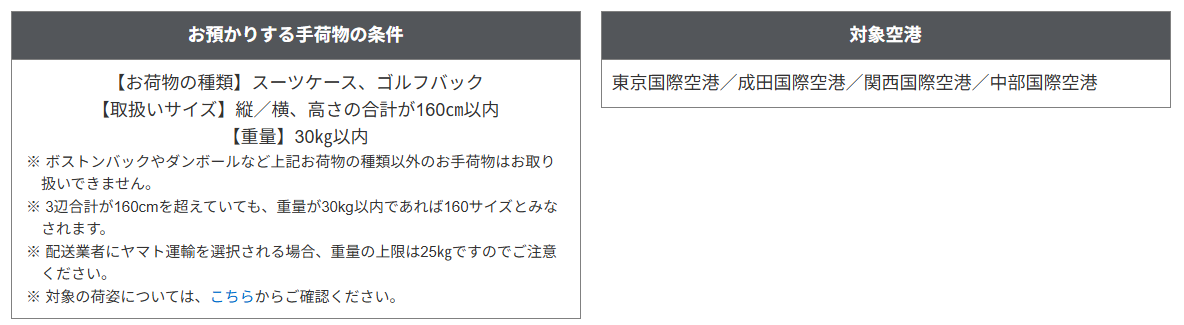 対するセゾンアメックスですが対象カードはセゾン・プラチナ(ビジネス)、セゾン・ゴールド、セゾン・ローズゴールドです。アメックスはスーツケースかゴルフバックのみだったけど、セゾンはボストンバッグもOKです。その他、送りたいものがあればOKか確認しましょう。帰国時は該当する全てのカードが使え、プラチナ(ビジネス)のみ出国時(自宅⇒空港)も無料です。帰国時は予約不要、出国時は出発4日前までに予約が必要です。https://www.saisoncard.co.jp/amextop/travel-delivery/