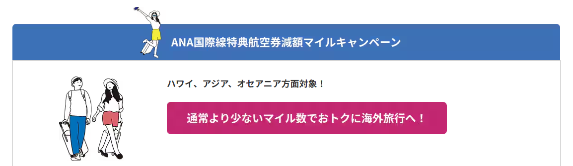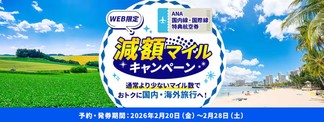 恒例のANA減額マイルキャンペーンですが、2月20日からの実施分は国内線と国際線が同時実施されます。国内線は4月搭乗分が対象、国際線の詳細は後日公開です。国際線はまだ分からないので、とりあえず計画は立てておきましょう。2月20日~28日までの実施です。貯めたマイルでお得に発券しましょう。