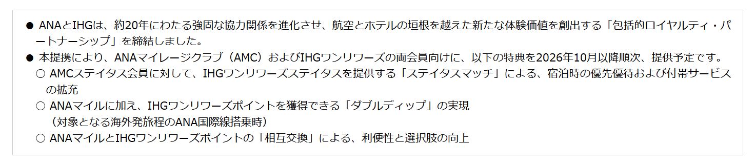 ANA×IHGの提携、ANAステータス保持者(SFC除く)にIHG宿泊実績付与、対象のANA海外発旅程時に通常マイルに加えIHGポイント付与、ANAマイルとIHGポイント相互交換開始