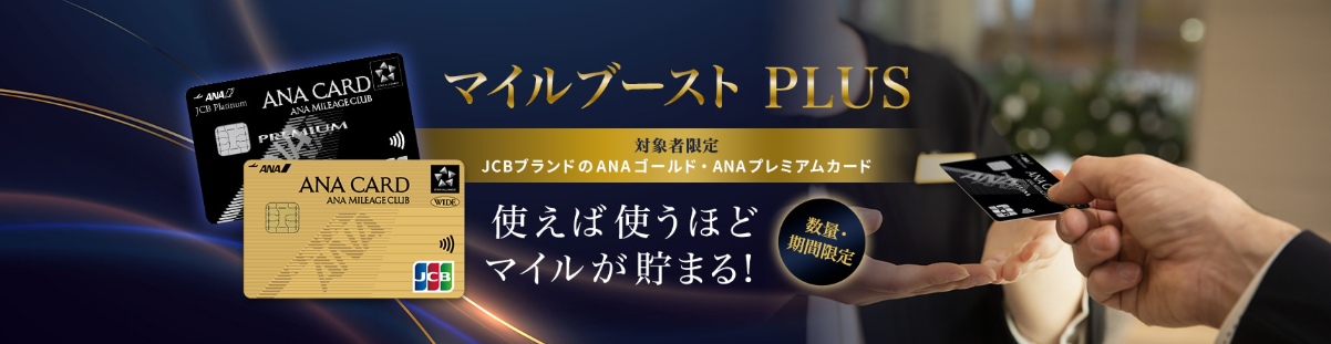 ANA JCBカードの面白いキャンペーンです。使えば使うほどお得になるマイルブーストPLUSが開始。ANA JCBゴールド、プレミアムカードが対象で通常マイルに加えて最大20,000マイル余分に獲得可能です。ただし、年会費が必要なのでメインカードにしている人や使う予定のある方にとっては良いかも。