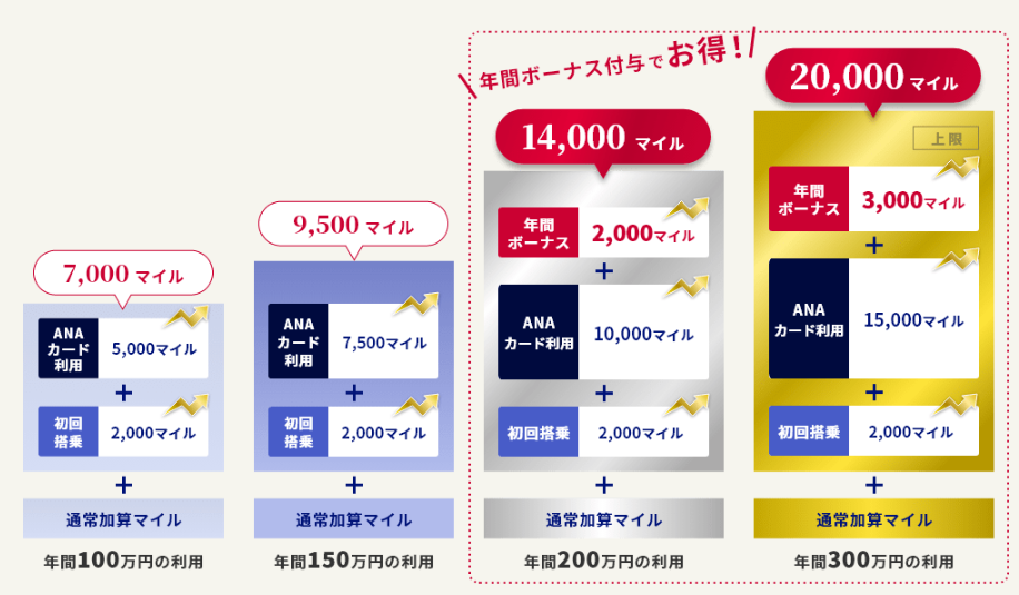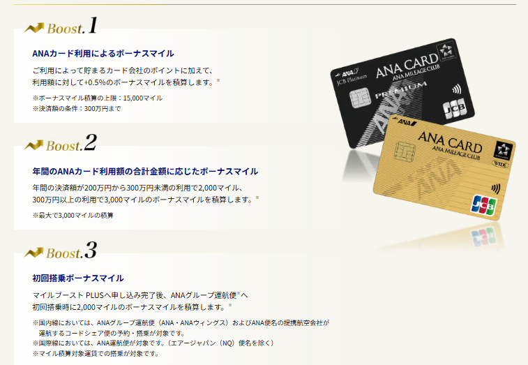 ANA JCBゴールドカード以上のブーストマイル、①通常ポイント+0.5%積算される(上限15,000マイル、300万利用まで)、②年間利用のボーナスが200~300万未満で2,000マイル、300万円以上で3,000マイル、③ANA便の初回搭乗で2,000マイルで計20,000マイル、年会費は13,980円