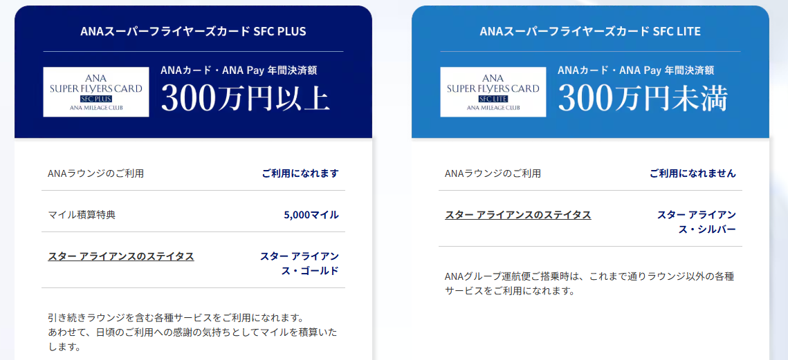 2028年度(2028年4月1日~)からSFC PLUSとSFC LITEに分かれ、 SFC PLUSはANAカード(ANA Pay)の年間決済額が300万以上でラウンジが利用可(スターアライアンスゴールド)+5,000マイル積算、SFC LITEは利用額が300万円未満でラウンジ利用不可(スターアライアンスシルバー)となります。尚、SFC LITEでもANAグループ運航時にはラウンジ以外の各種サービスが利用可能です。https://www.ana.co.jp/ja/jp/amc/premium/sfc/update2026/
