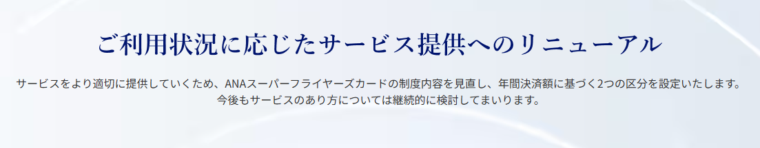 ANAスーパーフライヤーズカード(SFC)、2028年度(2028年4月1日~)からSFC PLUSとSFC LITEに分かれ、 SFC PLUSはANAカード(ANA Pay)の年間決済額が300万以上でラウンジが利用可(スターアライアンスゴールド)、SFC LITEは利用額が300万円未満でラウンジ利用不可(スターアライアンスシルバー)に