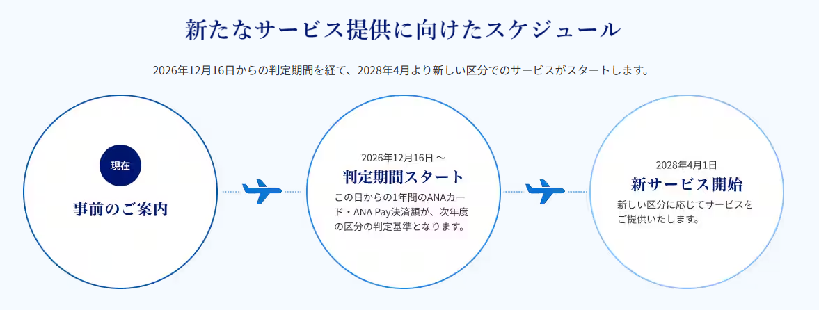 今後のスケジュールとしては、2026年12月16日~1年間の判定がスタートし、2028年4月1日から新サービスが適用となります。2028年3月31日までは決済額にかかわらず今まで通りの特典を享受できます。