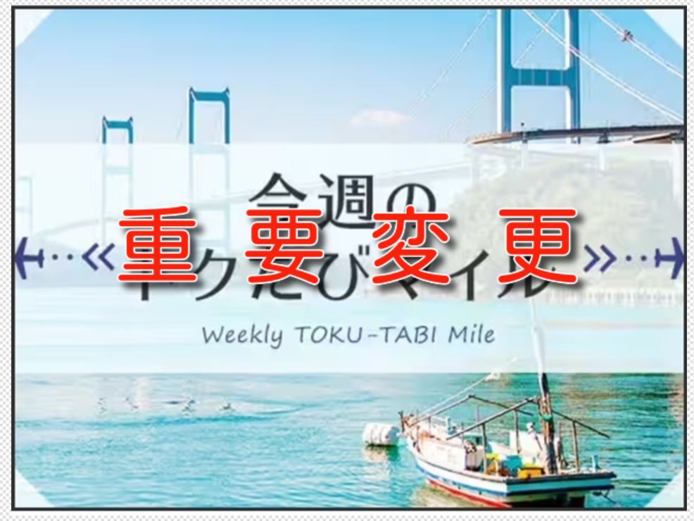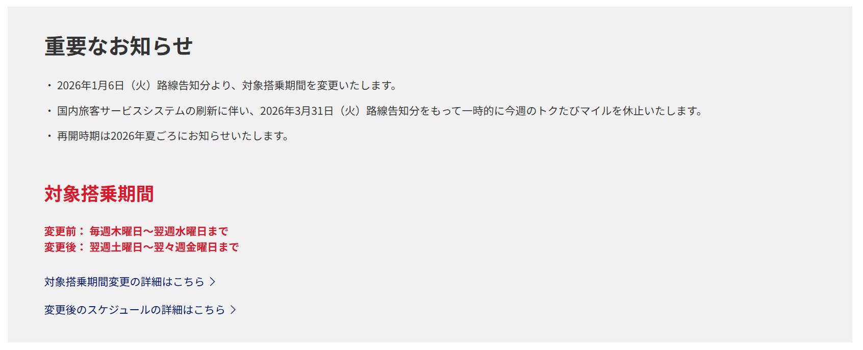 2025年末、大きな変更が来ました。トクたびマイルは毎週火曜12時に路線発表がありその翌日から1週間が対象期間でしたが、対象期間が翌週土曜~翌々週金曜までになります。せめて翌週金曜~にして欲しかった、、、まぁそこが狙いなんでしょうね、、、、加えて、2026年3月31日告知分を持って休止、再開は夏ごろを予定とのこと。休止するだけで終われば良いのですが、何か大きな変更もあるかもしれませんね。https://www.ana.co.jp/ja/jp/promotion/amc/wa_t/