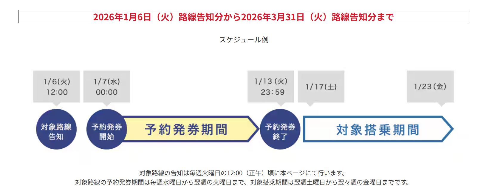 例えば、1月6日(火)に発表になる路線の対象期間は1月17日(土)~1月23日(金)になります。なんか今までの慣れから随分先に感じますね、、、