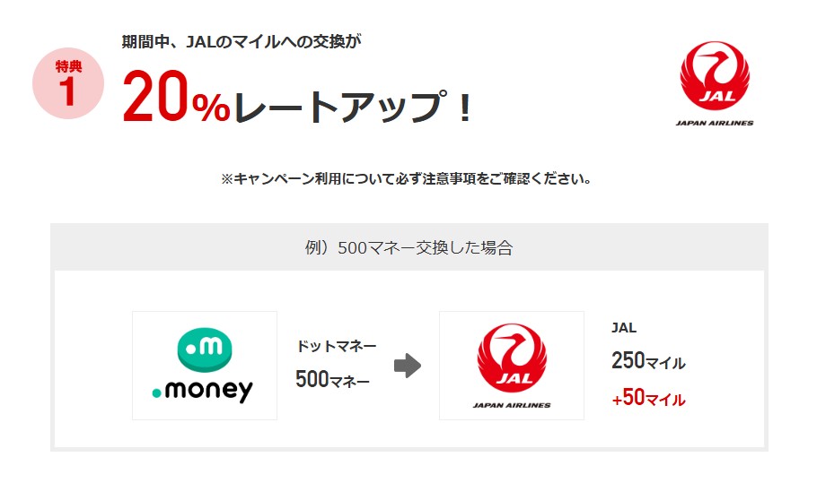 通常ドットマネー500⇒250JALマイルが20%アップの300JALマイルになります。各種ポイントサイトからドットマネーに交換し60%でJALマイルに移行できます。