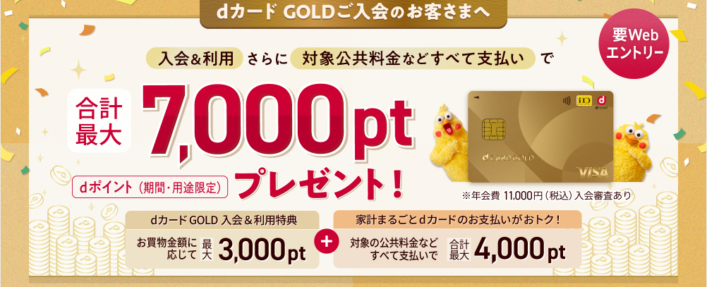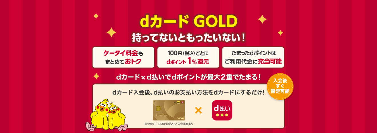 dカードゴールドは年会費11,000円。海外旅行保険は利用付帯。dカードの利用で5%還元、タッチ決済 or d払い(dカード決済)で10%還元、合わせて3,000円分が上限です。公共料金支払い設定で4,000ポイントポイント