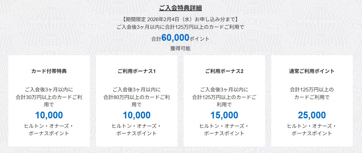 ヒルトンアメックス入会キャンペーン、入会後3か月以内に30万円の利用で10,000ポイント+80万円の利用で10,000ポイント+125万円の利用で15,000ポイント、125万円の利用で25,000ポイント