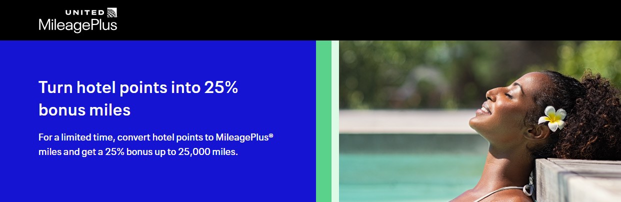 ホテルポイントをユナイテッド航空のマイレージプラスに移行すると25%増量となるキャンペーンが開催されます。2025年10月1日~31日(米EST)まで。