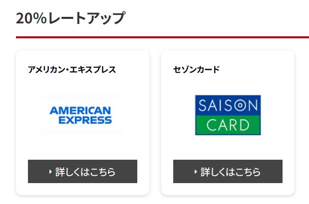 最大25%は分からず。20%は恒例のセゾンにアメックスも対象。レートは良くないけど、2,500ポイント⇒1,200マイル(通常1,000マイル、リワードプラス参加時)なら足りない分を補充するくらいなら良さそうです。
