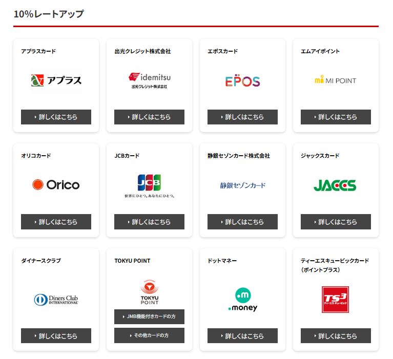 10%アップは以下。ドットマネーも久しぶりに対象。Pontaの増量にまわせば60%移行できるので、同時期にドットマネーからJALに移行する必要はないですが、、、
