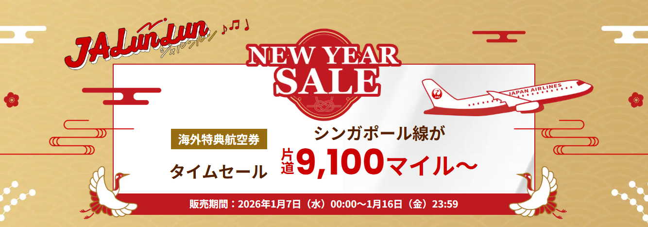 JAL国際線ディスカウントマイル。2026年1月7日~1月16日まで実施。エコノミーシンガポール9,100マイル、バンコク9,450マイル他。