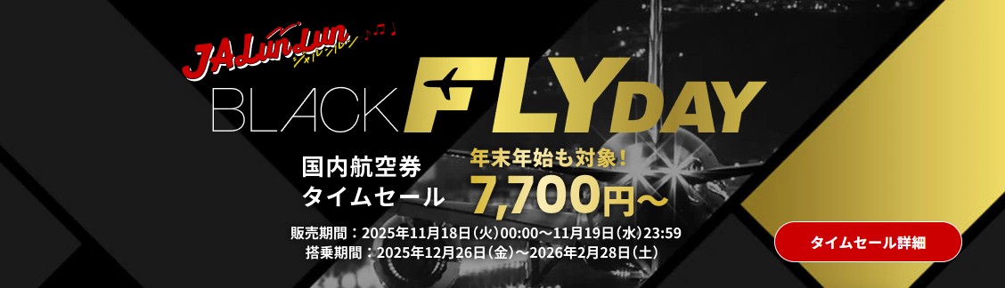 JAL国内線でタイムセール。2025年11月18日(火)~11月19日(水)に販売。プロモーション運賃で50%積算。