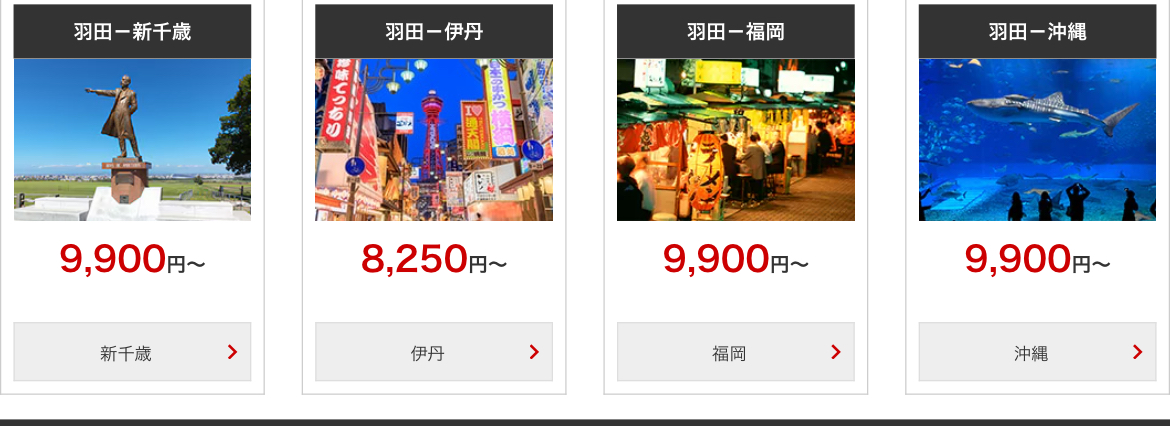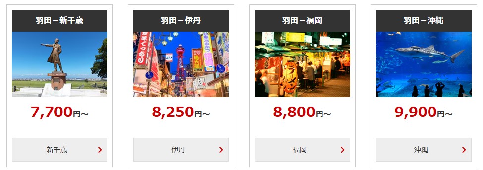 運賃例を見てみましょう。尚、対象路線でも全ての便での設定ではありません。JALさん頑張ってます。以下は最安値ですが、土日はプラスされる(空きがない)路線も多いです。