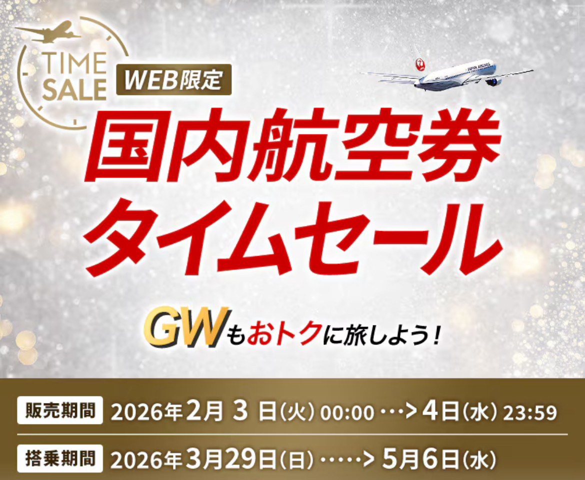 JAL国内線でタイムセール。2026年2月3日(火)~2月4日(水)に販売。プロモーション運賃で50%積算。