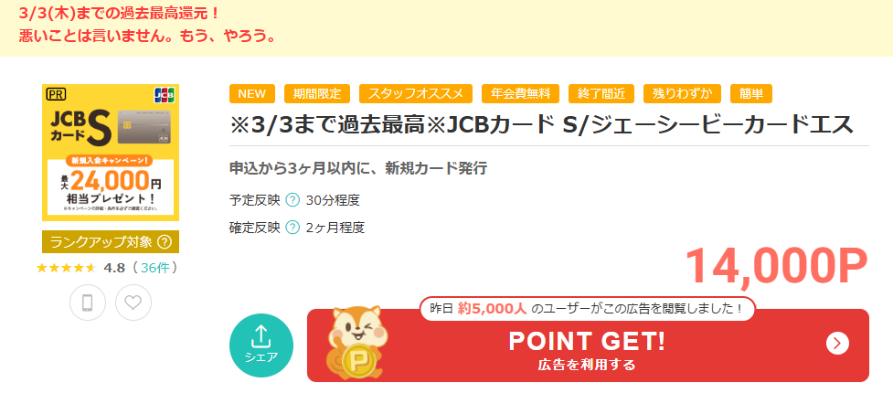 年度末にかけてポイ活は盛り上がります。先ずは年会費永年無料で14,000ポイントのJCB案件着弾、3月3日まで。おそらく14,000ポイントで天井でしょう。まだの方はお早めに!