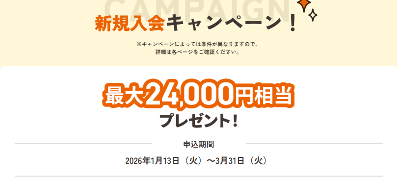 加えて、カード側のキャンペーンで最大24,000円相当がもらえます。スマホ決済で20%還元(最大15,000ポイント)、対象のJポイントパートナー利用で10%還元(最大8,000ポイント)、3万円以上の利用で1,000円キャッシュバックで計24,000円相当の還元です。3月入会の場合、利用期間は5月15日までとなります。過去にJCBオリジナルシリーズ(JCB W、JCBゴールド、プラチナ)に入会している場合は対象外です。