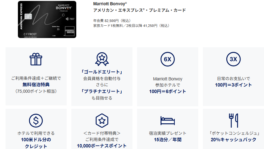 マリオットアメックスプレミアムの年会費は82,500円、プラチナ付与条件は500万、無料宿泊特典が年400万利用で75,000ポイント(ポイント追加で90,000ポイントの利用可)、年15泊の宿泊実績、マリオットゴールド付与が主な特典です。マリオットのライフタイムを狙っている、決済でプラチナを目指す人にはとってはメリットのあるカードです。2026年4月14日までのキャンペーンで最大115,000ポイント獲得可能です。