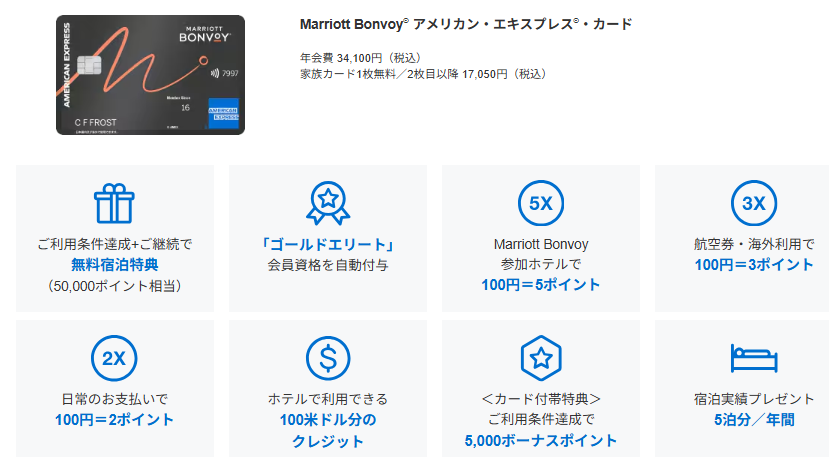 マリオットアメックスは年会費34,100円、無料宿泊特典が年250万利用で50,000ポイント(ポイント追加で65,000ポイントの利用可)、年5泊の宿泊実績、マリオットゴールド付与が主な特典です。2026年4月14日までのキャンペーンで最大55,000ポイント獲得可能です。