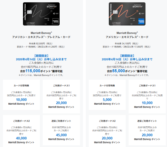 マリオットアメックスプレミアムは2026年4月14日までのキャンペーンで最大115,000ポイント、ノーマルカードは最大55,000ポイント獲得可能