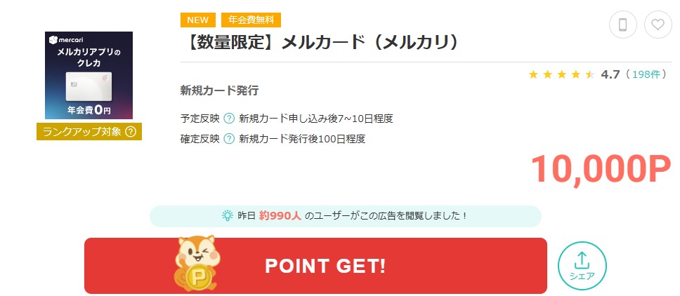 終了間近で緊急アップ、10,000ポイントに。年会費は永年無料。メルカリ利用者はもちろん、使ってない人もGo案件です。アプリからの申し込みなので注意。