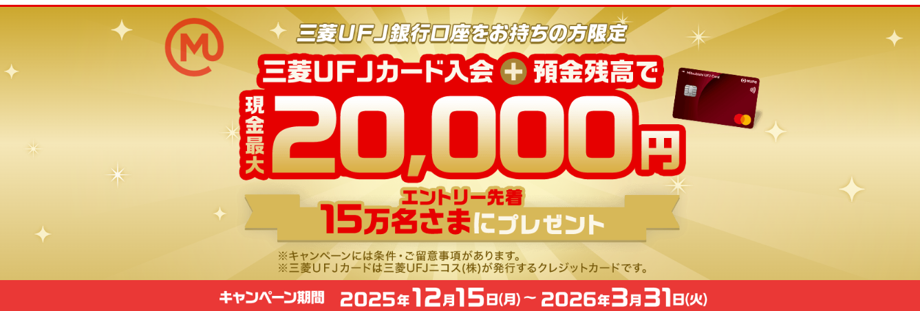 三菱UFJ銀行、先着15万名、三菱UFJカードを新規に作成(2025年12月15日~)し2026年3月31日23時59分時点で預金残高に応じて最大20,000円もらえる
