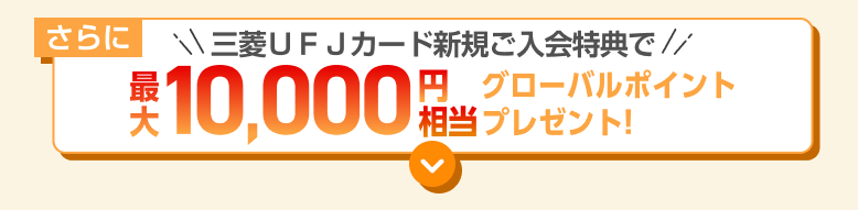 さらに、新規発行で最大10,000円相当のポイントがもらえます。入会日から翌月末までに①MDC(三菱UFJニコス)アプリにログイン、②ショッピング利用(1円~3万円未満で1,000円相当、3万円~10万円未満で3,000円相当、10万円以上で10,000円相当)で達成。
