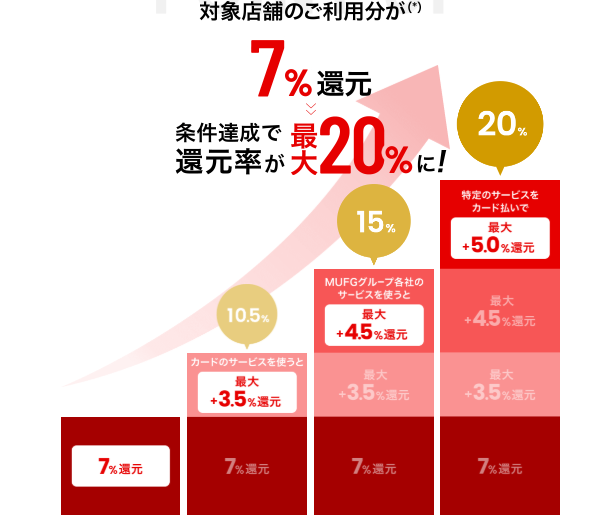 三菱UFJカードは対象店舗で最大20%還元が可能です。(要エントリー)オーケー、オオゼキ、東急ストア、スシロー、松屋、ローソン、セブンイレブン等が対象です。最大20%クリアは難しいけど10%なら容易に行けそうです。