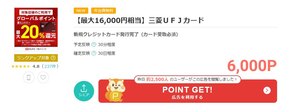 2の対象となるクレジットカードは、三菱UFJカード、三菱UFJゴールドカード、三菱UFJアメリカンエクスプレスカードです。引落し設定は必ずエントリーした三菱UFJ銀行の口座にしてください。既に三菱UFJカードを保有している場合も追加であればOKです。おすすめは永年年会費無料の三菱UFJカードでモッピーで6,000ポイントで出ています。