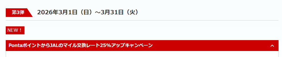 PontaからJALマイルは通常50%の移行率が今回は25%レートアップなので62.5%で移行できます。いつものキャンペーンだと20%レートアップで60%なので2.5%増えた形です。https://www.jal.co.jp/jp/ja/121campaign/2026/ponta-10th/