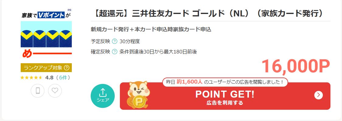 モッピーで16,000ポイントとして出ています。初年度無料は嬉しい。他の三井住友カード(NL普通カード含む)を持っていても三井住友カード ゴールド(NL)が初めてなら対象となります。オーロラデザインは別ページでの申込みが必要。家族カード発行が条件です。