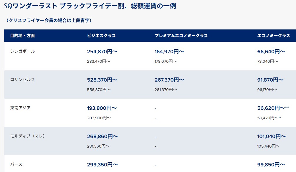 今回はブラックフライデーのキャンペーンです。運賃は燃油サーチャージ込みなので分かりやすい。(プロモコード SQBF2025)
