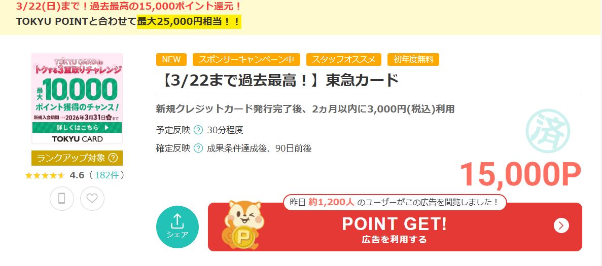 TOKYU CARD ClubQ JMBゴールド、TOKYU CARD ClubQ JMB、TOKYU CARD ClubQ JMB PASMOを発行して2か月以内に3,000円利用して15,000ポイント。