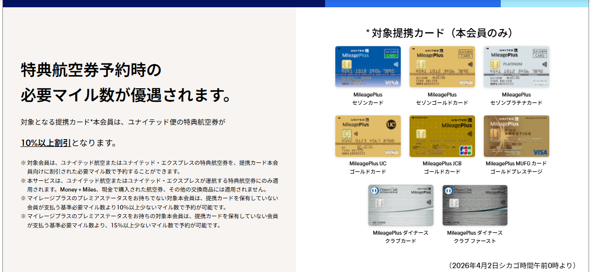 2026年4月2日から始まったユナイテッド航空の提携カード保有による特典航空券の10%以上の減額は、ユナイテッド航空、ユナイテッド航空エクスプレス運航の特典航空券に適用されます。対象の提携カードはマイレージプラスセゾンカード、マイレージプラスセゾンゴールドカード、マイレージプラスセゾンプラチナカード、マイレージプラスUCゴールドカード、マイレージプラスJCBゴールドカード、マイレージプラスMUFGゴールドプレステージ、マイレージプラスダイナース、マイレージプラスダイナースファーストです。年会費の安いJCBクラシックは対象外なので注意。持つなら3,300円のマイレージセゾンが無難ですね。尚、マイレージプラスのステータス保有の場合は15%以上の減額が適用されます。https://unitedair.jp/mpjapan/
