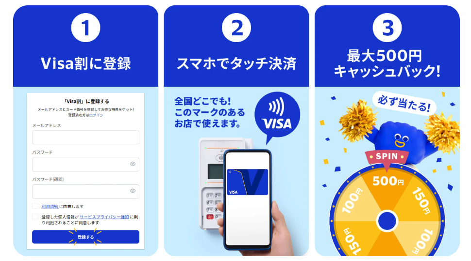 Visa割キャンペーンで外れ無しキャッシュバック、2026年2月10日~4月30日まで(3月26日で早期終了)1等500円(当選確率10%)、2等150円(当選確率30%)、3等100円(当選確率60%)