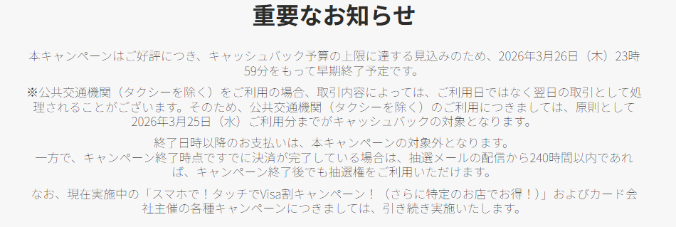 2026年2月10日から始まったスマホでタッチ決済でのVisa割キャンペーンですが、約1か月使ってみてのキャッシュバック率を振り返りたいと思います。Visa割は1,000円以上のタッチ決済が対象(要エントリー)で1等500円(当選確率10%)、2等150円(当選確率30%)、3等100円(当選確率60%)で外れなし!まだの方はこの機会にやってみましょう!尚、4月30日までの予定が3月26日で終了となります。(涙)