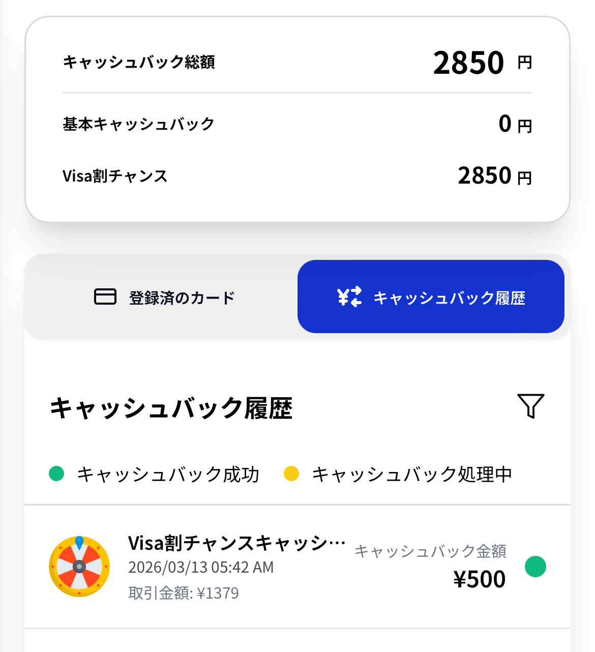 私はこれまで12回ルーレットを回しました。500円×4回、150円×1回、100円×7回で1回当たりのキャッシュバックは237円となります。外れ無しのVisa割は期待値155円なので現在は上回っていますが、回数が増えていくと収束していきますが現段階では上出来かなと。